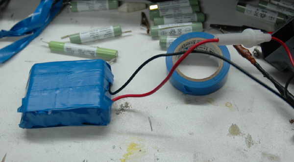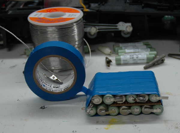|  | Nach dem abkühlen der Lötstellen biege ich die Lötfahnen in Richtung des- Pol um. Zwischen die Akkus habe ich eine alte Platine als Trennung gelegt. Wenn es doch mal einen Kurzschluss gibt und die Isolierung der Akkus schmilzt, soll nicht gleich alles hochgehen. Den Akkupack habe ich mit Isolierband umwickelt. Das ist keine Lösung für die Ewigkeit, ausreichend grosser Schrumpfschlauch wäre besser. |