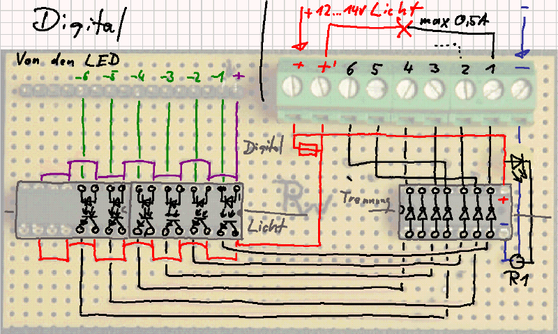 Der Pluspol vom Licht wird über eine elektronische Sicherung geführt, größe z.B. 1 Ampere. Die Sicherung wird nicht verhindern können, dass das Treiber IC durchbrennt, sollte aber größeren Schaden verhindern, falls der Lichtstomkreis stärker abgesichert ist. An dieser Stelle der Hinweis, dass diese Schaltung nur für Licht-Gleispannung bis ca. 15V ausgelegt ist.