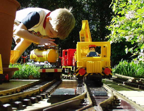 |  | Ich bin schwer begeistert von den Schienen von Stephan Strub vom Gartenbahnteam! Im Aussenbereich ist die Stromübertragung weit besser wie bei den Messingschienen von LGB. Innerhalb der Edelstahlstrecke befindet sich eine Original LGB Weiche und ein Abstellgleis mit LGB Gleisen. Dieses kurze Messingstück machte erheblichen Ärger im Gegensatz zu den Edelstahlschienen. Die Gleise sind ohne Biegemaschiene gebogen, was einigermassen ging. Um gleichmässige Bögen zu bekommen, muss man sehr behutsam vorgehen. |