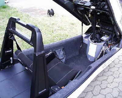 My own vehicle, constructed in 1989, also some has modifications. The defective closed hood has been converted to a Cabrio. The front side windows are retained, and the upper edge of the hood strengthened with an aluminum frame. The convertible top is stitched by a professional, domestic sewing machines cannot handle it. |