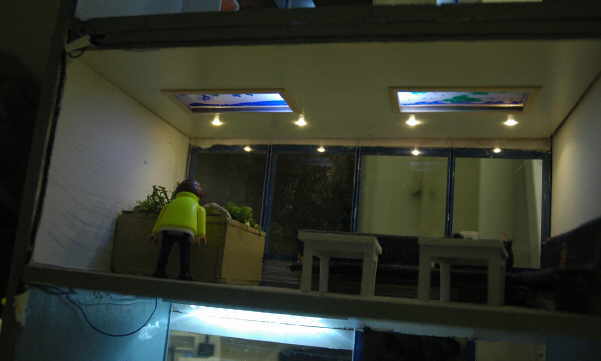 Man beachte die kunstvoll gemalten Deckenleuchten, von den Kindern gemalt. Auch das obligatorische Goldfischbecken hat Markus gebaut, mittels Förmchen und Kasten herum. |