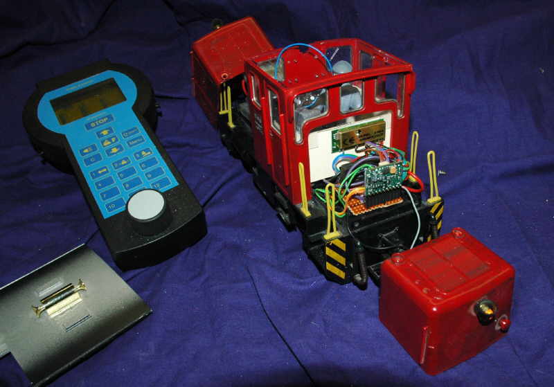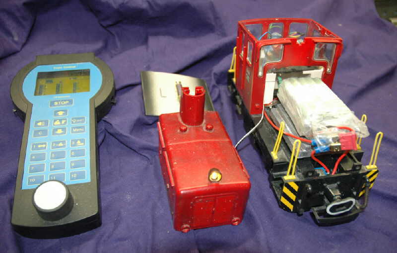 FührerhausIn´s Führerhaus ist das Gewicht von hinten gewandert. Das Gewicht eignet sich als Kühlkörper für den Spannungsregler (7820 + Diode); für die Akkuladeschaltung. Die Antenne sitzt dort unter dem Dach. Die Funkverbindung hat deutlich Probleme gemacht. Die Funkverbindung ist leicht störbar, solange Schienenstrom vorhanden ist, insbesondere wenn dieser "unsauber", d.h. schlecht gesiebter Gleichstrom ist. Die beste Funkverbindung gibt es bei reinem Akkubetrieb. |
