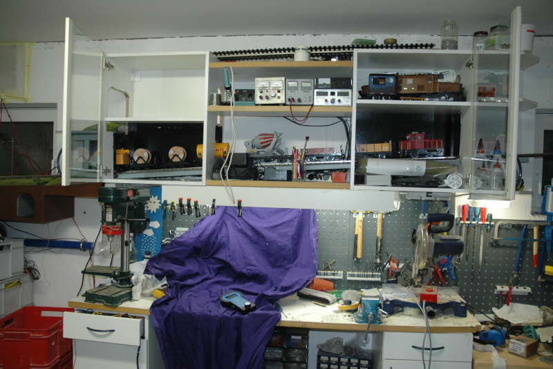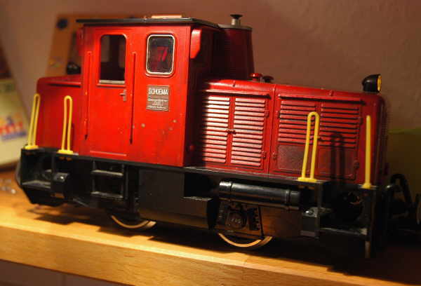 AkkubetriebIch lerne den Akkubetrieb zu schätzen, da keine Verunreinigung weder drin noch draussen die Lok stoppt. Über meine Nachladung per Schiene kann ich die Lok jederzeit nachladen. Es geht steil bergauf, seit Januar 2006 auch quer durch die Schränke im Keller. |
