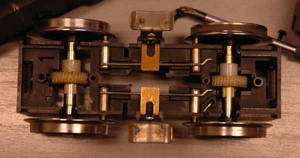 Schleifer, VerschaltungBei den älteren Motorblöcken gibt es eine feste Verbindung zwischen Schleifer und einem Motoranschluss. Diese Verbindung muss am Motor unterbrochen werden, ich habe dort eine Leitung an den Motor gelötet. Auf der Unterseite habe ich die Schienenschleifer entfernt, die vier Radschleifer sind geblieben. Nachdem mit Akkus gefahren wird und über die Schiene noch nachgeladen wird, ist die Stromübertragung nicht so wichtig. Das Fahrverhalten und die Zugkraft hat sich durch die Entfernung der Schienenschleifer deutlich verbessert. |