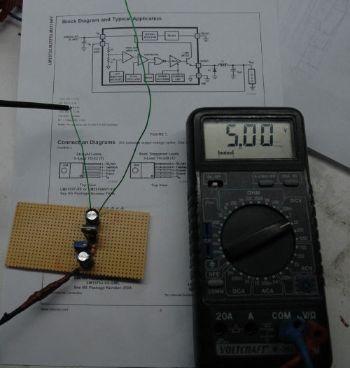 Ich habe das erste mal eine Platine mit kurzen Streifen genommen... das klappte nicht gut. Mit einer Streifenplatine tut man sich leichter. Die Spannung steht bei 5,00 Volt, geht bei 0,1A Belastung nur minimal , d.h. ca. 4 mV zurück, vernachlässigbar. Der Schaltregler ist bis 1A belastbar, muss dann aber gekühlt werden. Ich belaste mit 150 mA, dass geht noch ohne Kühlkörper.