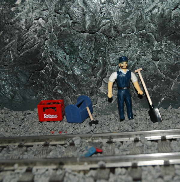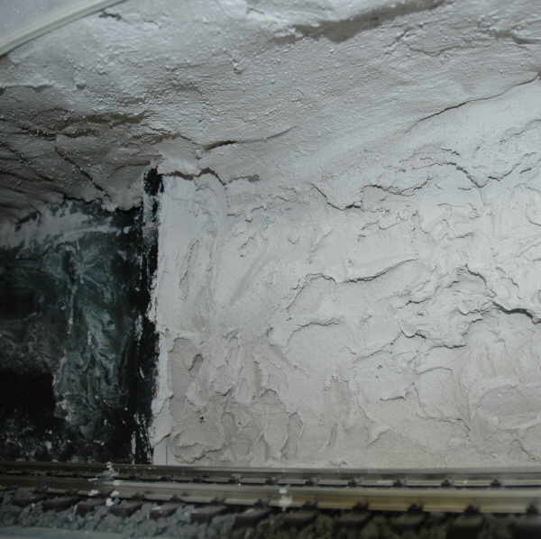 Das geht so: Die Werkzeugschränke sind Küchenschränke, d.h die angrenzenden Wände sind aus Holz. Als Decke wurde eine Hartfaserplatte parallel zu den Schienen eingezogen. Die Felsen lassen sich prima aus Gips modellieren. Der Gips hält auf dem Holz, indem man Klammern in das Holz tackert und zwar nur soweit, dass die Klammern einige Millimeter aus dem Holz herausstehen. Der Gips, bzw. Maschinenputz wurde von meinem Sohn und mir nur an die Wand geschmiert. Viel modellieren muss man da gar nicht, das sieht auch so schon ganz gut aus. An der Wand ist der Gips rauh (Felsen) an der Decke glatter (Spritzbeton). |