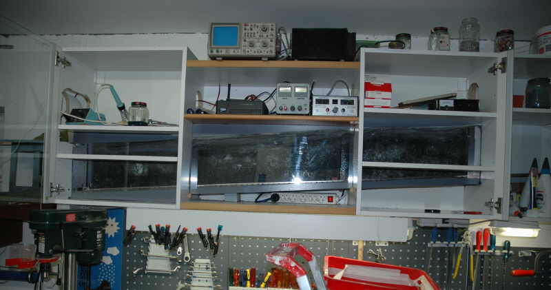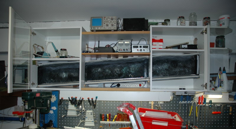 | In der nächsten Stufe habe ich Plexiglasplatten vor den Tunnel gebaut um etwas Staubschutz zu haben. Der Bereich vor dem Tunnel kann jetzt auch wieder als Regal genutzt werden. |