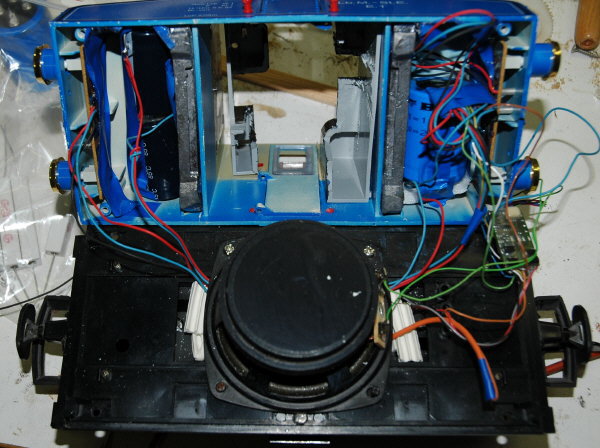 SoundMit den Dietz Soundmodulen bin ich sehr zufrieden, darum kommt hier auch wieder einer zum Einsatz. Gekoppelt wird über die steckbare SUSI-Schnittelle am Zimodekoder. > Einstecken und geht!< So mag ich das! Mit den Einstellungen bin ich noch am tüfteln, mit lastabhängigen Lüftergeräuschen klappt es schon ganz gut. Auch die Schaltgeräusche der Stufenschalter gefallen mir als "Stromer" ganz gut. Mit der Lautsprechergröße was es wieder eine schwere Entscheidung. Ich habe mich jetzt wieder für einen größeren Visatonlautsprecher entschieden, der nach Hörprobe am besten klingt und sowieso noch da war. Um den Lautsprecher so montieren zu können mussten Kompromisse gemacht werden. Ein Teil der Inneneinrichtung musste weichen und die Türen können nicht mehr geöffnet werden. Den härtesten Teil hatte der langjährige Lokführer zu tragen, er wurde Bein amputiert und klebt jetzt auf dem Lautsprecher. |