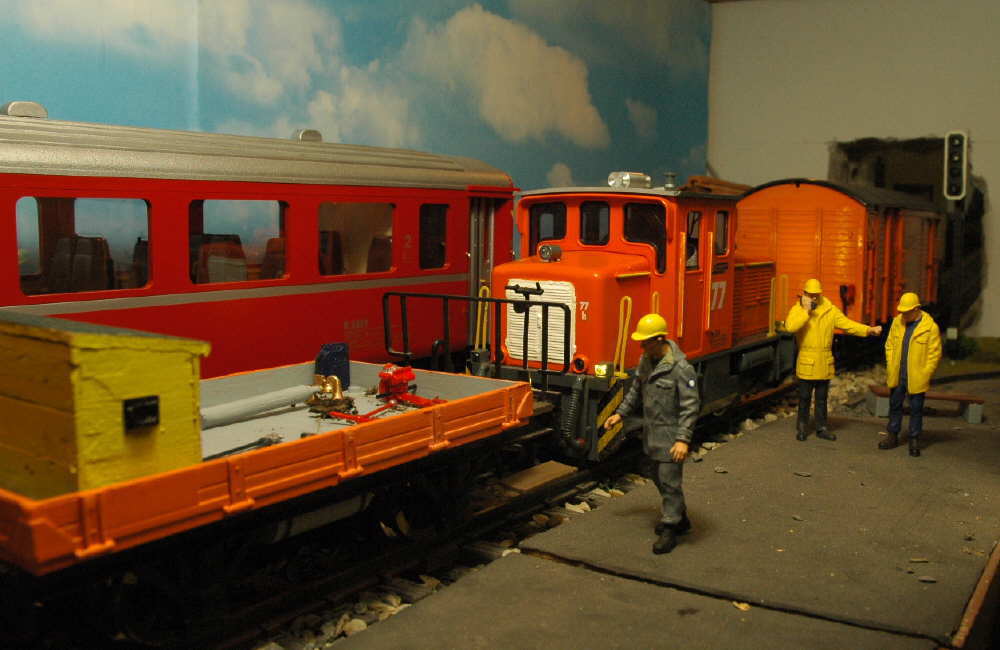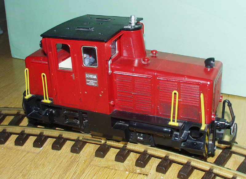 Die Schöma habe ich defekt bei ebay erstanden. Jemand anders hatte sich schon an der Alterung versucht. Die Lok war als E-Rottenlok mit Stromabnehmer versehen. In dieser Form war die Lok einige Jahre im Einsatz.