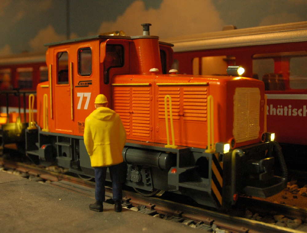 Den Dekoder musste ich dadurch in das Führerhaus hinter den Fahrer stecken. Rechts und links vom Fahrer sind mittlerweile noch kleine Säcke mit Bleigewichten zur Zugkrafterhöhung. Die Schienenschleifer sind entfernt, dadurch hat die Lok einiges an Zugkraft gewonnen. Als Rangierlok ist die Schöma heftig im Einsatz. |