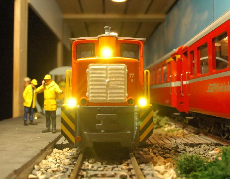 Was nicht ist kann vielleicht noch werden, insofern habe ich meine Schöma mal „RhB´isiert“. In Anlehnung an die FO Lok gibt es jetzt eine Dreilichtbeleuchtung. Für die Befestigung der zusätzlichen Scheinwerfer unten wurde ein Querprofil und quadratische Scheinwerfergehäuse aus Messing montiert. Die Verschaltung ist gemäß RHB mit einem Scheinwerfer rechts unten als „Rücklicht“. Eingebaut habe ich warmweiße 5mm LED, die mit nur 1/3 Leistung betrieben werden. Trotzdem sind die LED heller als alle anderen Loklichter… das macht richtig hell auf der Strecke. Besser wären SMD LED gewesen um die Scheinwerfer flacher zu gestalten, das wollte ich mir allerdings vom Handling her nicht antun. |