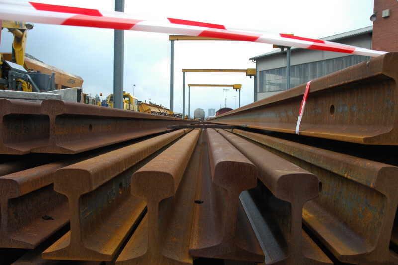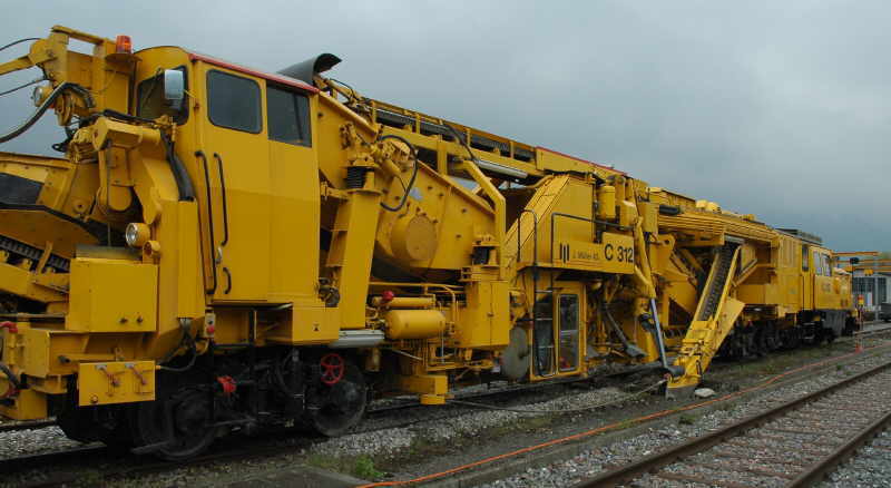 Diese Maschine tauscht den Schotter aus. Ein Förderband nimmt den Schotter unter dem Gleis weg.
