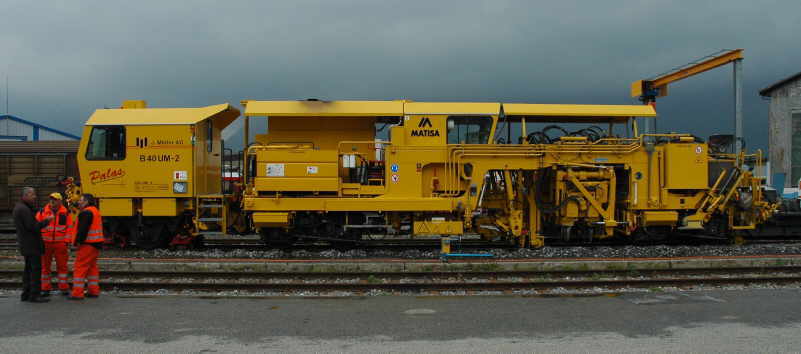 Die Stopfmaschine fährt mit Armen und rüttelt und verdichtet / stopft den Schotter.