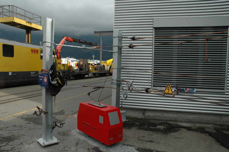 Extra für den Tag der offenen Tür wurde ein Stück Oberleitung montiert, die man ausnahmsweise mal "begreifen" konnte. Montiert waren Bernina-Isolatoren, d.h. für 1000 Volt Gleichspannung. Die übrige RhB fährt mit 11 kV Wechselspannung, da braucht es größere Isolatoren.