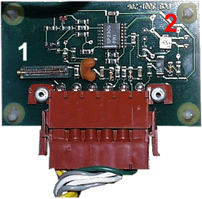 Der längliche Spindelpotentiometer (1) ist ein zum Fahrpoti parallelgeschaltetes Poti und stellt das maximale Tastverhältnis ein. Damit läßt sich die Endgeschwindigkeit feineinstellen, da die Motoren etwas streuen. Dreht man den Poti ganz nach links, ist die maximale Geschwindigkeit erreicht. Der kleine SMD Poti (2) dient zur Einstellung des Batteriestromes, nominal steht er bei etwa 120A Batteriestrom. Bei maximaler Einstellung gibt er etwa 150 A frei. Findige Bastler können sich den Poti auch "rauslegen" also von Hand einstellbar machen. Potentiometerwert 200 Ohm, mit einem 470 Ohm Poti hat man einen erweiterten Stellbereich. Oben links auf der Platine ist noch eine kleine LED, welche die Strombegrenzung anzeigt. Eine manuelle Einstellung des Fahrstroms ist sehr angenehm. Bei "Sparfahrten" kann man den Strom auf einen bestimmten Wert reduzieren und kann dann sicher sein, daß keine Stromspitzen die Batterie belasten. Einen solchen Regler nennt man im Jargon auch "Dampfrad".