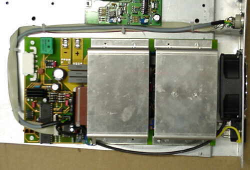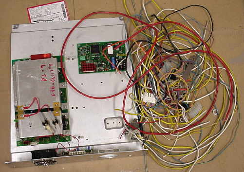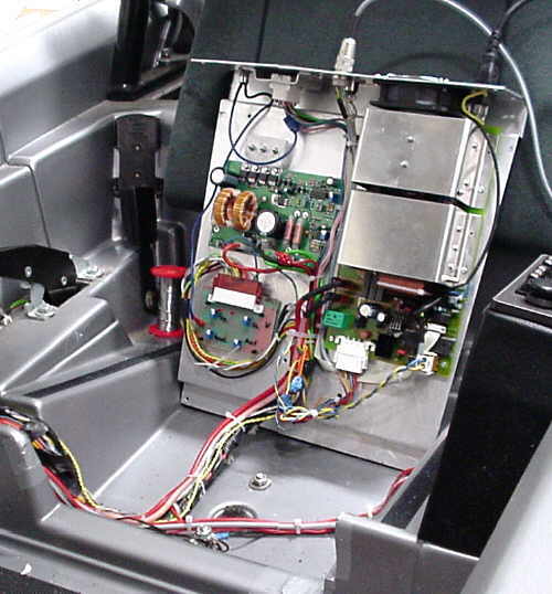 Das Ladegerät ersetzt den Ladeprint unter dem Sitz und den Transformator im Kofferraum. (auf der rechten Seite) Der alte Ladeshunt entfällt. Links oben im Bild DC/DC Wandler, links unten die neue Strombegrenzerpaltine mit der Zusatzfunktion Fahrzstromanzeige im Tacho. Das Ladegerät hat offenbar genug Leistung um auch 48 V Systeme zu laden, dazu muß allerdings ein Zusatzkühler vorgesehen werden. |