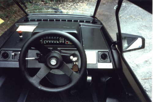 | Das Armaturenbrett hat zwei große hinterleuchtete LCD Anzeigen, für die Geschwindigkeit und die Kapazität. Rechts vom Lenkrad ist ein Tastenfeld zur Bedienung der Beleuchtung, Heizung Scheibenwischer. Ganz rechts und links sind zwei Lüftungsklappen - die gibts im neuen el leider nicht mehr. Auf der linken Seite gabs noch zwei Hebel, zum einen um die Fiußfeststellbremse zu entriegeln (wie im Mercedes) zum anderen für die Lüftung um die Umluftklappe zu betätigen. | ![]() |