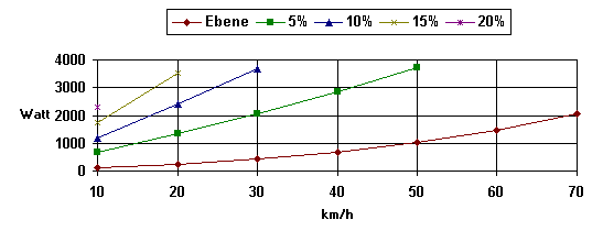 Required power at the wheel in Watts as a function of speed with different gradients