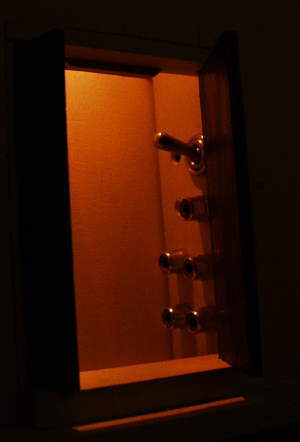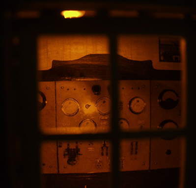 In filigraner Feinarbeit... ...Nein, hier habe ich fürs Auge ein Foto einer alten Schaltanlage aufgeklebt, die ich im Technikmuseum in Sinsheim aufgenommen habe. Die Leuchte an der Decke, hier leider nicht zu erkennen, war ein Versuch der für "draußen" nicht hübsch genug war. Die Leuchte ist aus einem Stopfen einer Gardinenstange entstanden. ... Mit welchen Gedanken ein Modellbauer durch die Wohnung geht... Unterhalb des Fensters gibts auch einen Zwischenboden den man rausnehmen kann. |