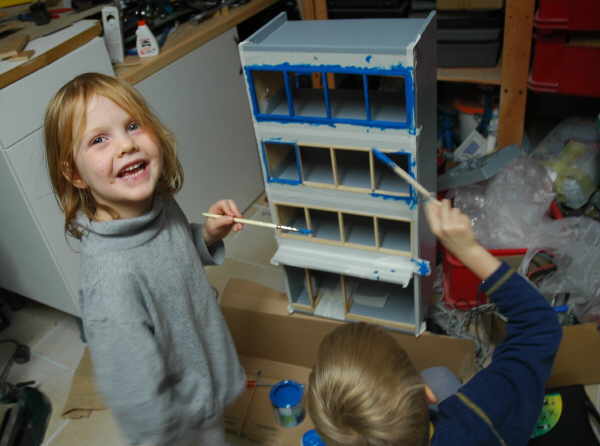 Aus einigen Restplatten habe ich den Kasten gesägt. Die Fensterrahmen wurden aus Leistchen gesägt. Markus und Anja streichen hier die Fensterrahmen. |