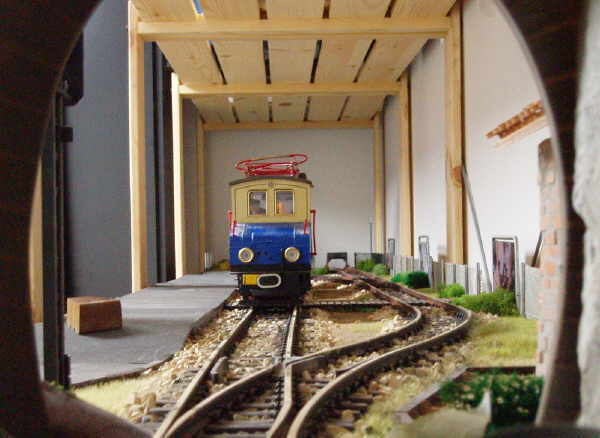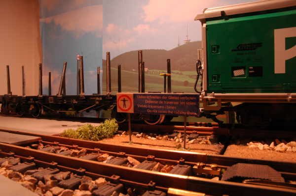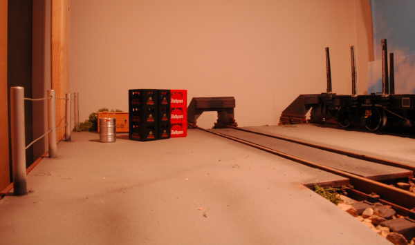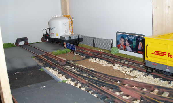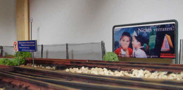 Es gibt eine kleine erhöhte Laderampe und verschiedene Schilder. Auf der Rückseite ist ein Zaun (Metallstützen und Alu-Streckmetall). Die Werbeplakate sind aus Metallstangen gebogen (nicht benötigtes Stützkreuz des Regals), darin abfotografierte und einlaminierte Werbung aus der Schweiz. |
