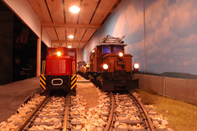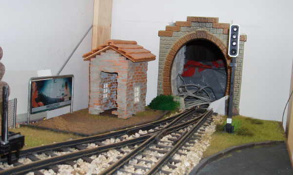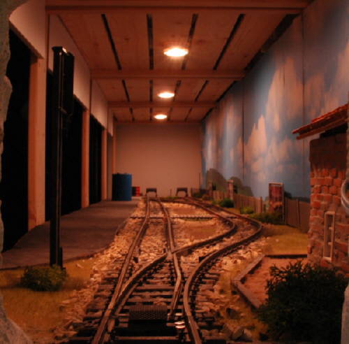 An meiner Anlage gibt es die schöne Möglichkeit von dem Garten in den Keller zu fahren. Um zumindest zwei Züge abzustellen habe ich einen Schattenbahnhof im Vorratsregal entworfen. Der Bahnhof ist über einen Wanddurchbruch angeschlossen. Von dort geht es in einer grossen Schelife bis unter die Decke und dann weiter nach draussen.