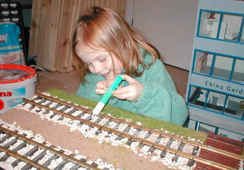 Anja hilft beim Einschottern und verkleben des Schotters. Eigentlich sollte es nur ein "Schattenbahnhof" werden, letztendlich habe ich doch noch einiges an Gelände gebaut, so dass es doch mehr ein normaler Bahnhof wurde, der noch nicht fertig ist. |