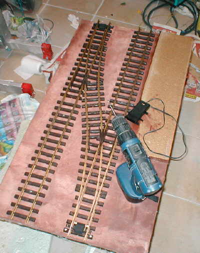 Die Weicheantriebe sitzen unsichtbar auf der Unterseite. Über Schubstangen in Messingrohren wird die Kraft nach oben gebracht. Bis dass lief habe ich eine Weile getüftelt. Im Moment schalten die Weichen sauber, ich fürchte aber, dass das keine dauerhafte Lösung ist. Wir werden sehen... |