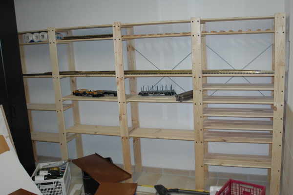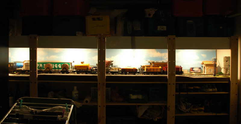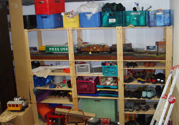 Das Kellerregal erfüllt auch seinen Zweck als Lagerregal. Der Bahnhof passt ganz gut rein. |