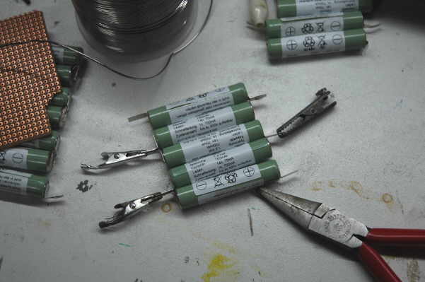 |  | Nach dem abkühlen der Lötstellen biege ich die Lötfahnen in Richtung des- Pol um. Zwischen die Akkus habe ich eine alte Platine als Trennung gelegt. Wenn es doch mal einen Kurzschluss gibt und die Isolierung der Akkus schmilzt, soll nicht gleich alles hochgehen. Den Akkupack habe ich mit Isolierband umwickelt. Das ist keine Lösung für die Ewigkeit, ausreichend grosser Schrumpfschlauch wäre besser. |