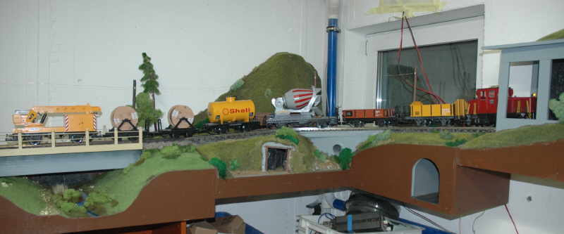 Der Blick über alle "Module". Man sieht hier den Höhenunteschied. Um meinen Wunsch zu realisieren von drinnen nach draussen zu fahren, musste ich diese extreme Steigung von 4-7% machen. Die kleine Schöma zieht den Zug noch gut hinauf. |