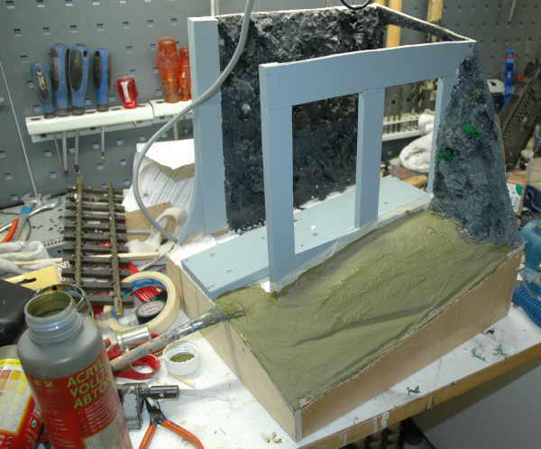 Vor dem Berg kommt ein Lawinenverbau. Modellierung FlächeDiesmal habe ich das Gelände unten mit Reststücken von Dämmplatte (die blauen vom Bau) modelliert. Die Platten übereinander mit Ponal verkleben, danach mit dem Messer schneiden. Auf die Platten habe ich Stoff gelegt und an den Seiten festgetackert. Auf den Stoff streiche ich direkt Abtönfarbe "umbra". In die nasse Farbe kann man begrasen. Modellierung FelsenDie Felsen sind wieder aus Gips entstanden, das geht prima. Die tieferen Stellen dunkel streichen, die Oberflächen etwas heller. |