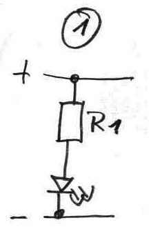 |  | Grundschaltung 1, LED mit Vorwiderstand:Die Standardschaltung... Die Spannung am Vorwiderstand R1 soll der Gesamtspannung abzüglich der Spannung an der LED sein. An LED´s fallen ca. folgende Spannungen ab: