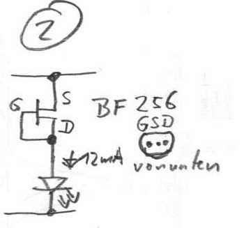 |  | Grundschaltung 2, LED mit FETSehr viel vornehmer ist die Schaltung mit einem FET Transistor! Die angegebene Schaltung funktioniert tatsächlich so einfach. Es fließen soweit die Spannung ausreicht ca. 12 mA durch den BF256 und die LED. D.h. der Transistor hält den Strom konstant egal ob 5Volt oder 25 Volt anliegen! Die Schaltung stammt übrigens von Vilems Seite mit LED Grundschaltungen, sehenswert! Auf dieser Seite ist auch gezeigt wie man den Strom noch weiter runterregeln kann. Ein Poti genügt. Alternativ kann man an den Transistor auch zwei oder mehr gleiche (!) LEDs hängen, die sich den Strom teilen müssen. Der Transistor kostet z.Zt. (2003-01) bei Conrad 0,68 Euro. Bei Reichelt 0,23 Euro. |