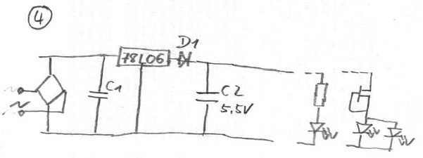 | Hinter dem Gleichrichter folgt ein 4,7u Tantalkondensatoren , danach ein Spannungsregler 78L06 (6V 100mA). Die nachgeschaltete Standarddiode z.B. 1N001 vermindert die Spannung um ca 0,6V, auf ca. 5,4-5,5V. Der C2 ist der (teure) Goldcap mit z.B. 5,5V 0,4Farad. | Nachschalten kann man entweder Grundschaltung 1 oder 2. Vor allem bei roten LED mit niedriger Spannung lohnt sich die FET-Schaltung. Man kann hier z.B. eine oder zwei weiße LED für die Innenbeleuchtung eines Wagens und eine rote LED für ein Schlusslicht betreiben... damit sich der Aufwand auch lohnt. |