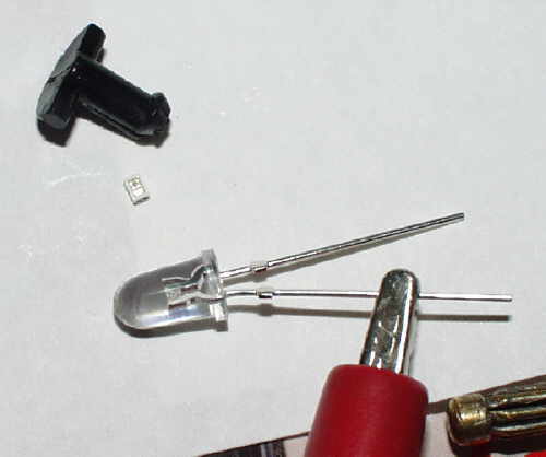 | Noch ein Wort zu LED´sGlühlampe oder LEDGenerell sind natürlich auch Glühlampen einsetzbar, jedoch ist der Goldcap Kondensator entsprechend schneller leer. Mit LEDs lässt sich die Energie besser ausnutzen. Alle Komponenten der Schaltung müssten für Glühlampen entsprechend verstärkt werden. Lichtstark...Leider eignen sich nur die teuren LEDs mit der hohen Lichtausbeute für die Beleuchtung! Insbesondere die weißen LED ´s sind geeignet. Leider kostet eine LED im Moment (2003-01) 3-4 Euro. Auch bei gelben oder roten LED muss man auf den richtigen Typ achten, d.h. Lichtausbeute ab 1cd, gute weiße LEDS können Stand 2003/09 schon 9 cd. SMDIch war auf die "glorreiche" Idee gekommen ich könnte es auch mal mit SMD LED´s versuchen... Wenn mir klar gewesen wäre was für ein Zuckerkrümel das ist.... hätte ich es gleich gelassen. Es gibt zwar auch helle SMD LED, allerdings überlasse ich die den MiniTrix Bastlern. Für die Spur IIm ist man mit 3 oder 5 mm LED gut bedient. |