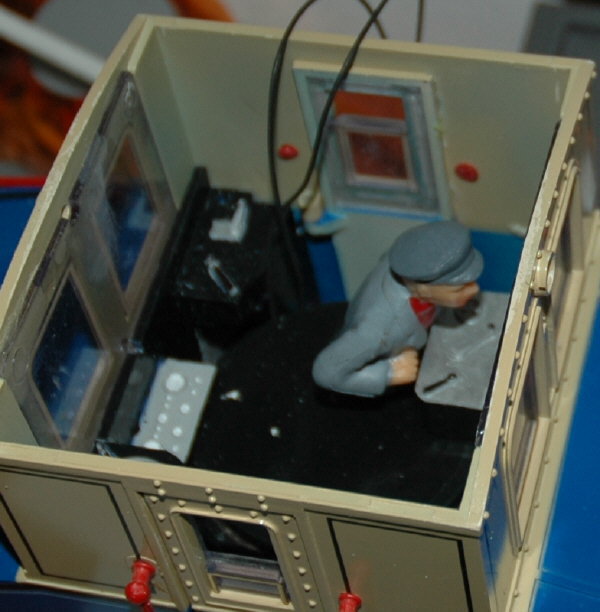 Der Lokführer hat eine rote Kontrolleuchte (LED) im Fahrpult, die direkt mit dem Dekoder verbunden ist. Die LED ist eine gute Kontrolle ob die Lok Strom hat. Für die Innenbeleuchtung habe ich eine kleine Deckenleuchte montiert, die ich über den Dekoder steuern kann. |