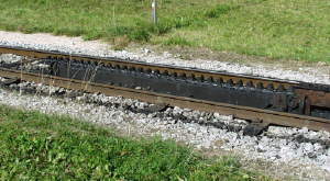 Der Anfang der Zahnstange in Jenbach. Der erste Teil der Zahnstange ist federnd gelagert. |