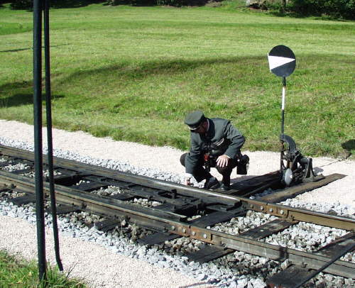 Die Weiche zu stellen ist Handarbeit. Erst wird eine Verriegelung am Gleis gelöst, dann wird das Gewicht umgelegt. |